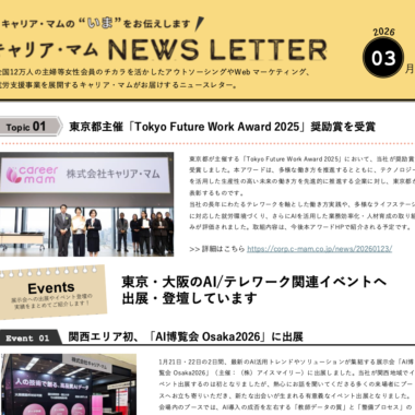 ブログカテゴリキャリア・マムnewsブログタグニュースレター 2026年2月3日 / 最終更新日時 : 2026年2月3日 経営企画・総務 キャリア・マムの最新活動をお届け~ニュースレター(2026年3月号)発行のお知らせ~ キャリア・マムより、当社の活動をまとめた ニュースレター(2026年3月号)発行のお知らせです。 今号では、 今回のニュ... ブログカテゴリキャリア・マムnewsブログタグコワーキング、サテライトオフィス 2026年1月27日 / 最終更新日時 : 2026年1月27日 経営企画・総務 「東京都サテライトオフィス交流フェア」に出展しました! 1月15日(木)、東京たま未来メッセにて開催された サテライトオフィス事業者との交流イベント 「東京都サテライトオフィス... ブログカテゴリキャリア・マムnewsブログタグ届かなかったラヴレター 2026年1月14日 / 最終更新日時 : 2026年1月14日 経営企画・総務 「届かなかったラヴレター」受賞作品が『公募ガイド』に掲載されました。 現在発売中の『公募ガイド』冬号の「入賞作品Collect」コーナーに、 「届かなかったラヴレター2025」の受賞作品が掲...
