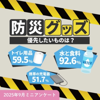 ほんねリサーチ 2026年1月23日 / 最終更新日時 : 2026年1月23日 経営企画・総務 ミニアンケート結果 防災意識と備蓄チェック 「防災グッズで優先したいものは?」という質問で最も多かった回答は、 水と食料(92.6%)でした。 災害時に最も早く不足し、かつ代替が効かないため、危機意識が非...