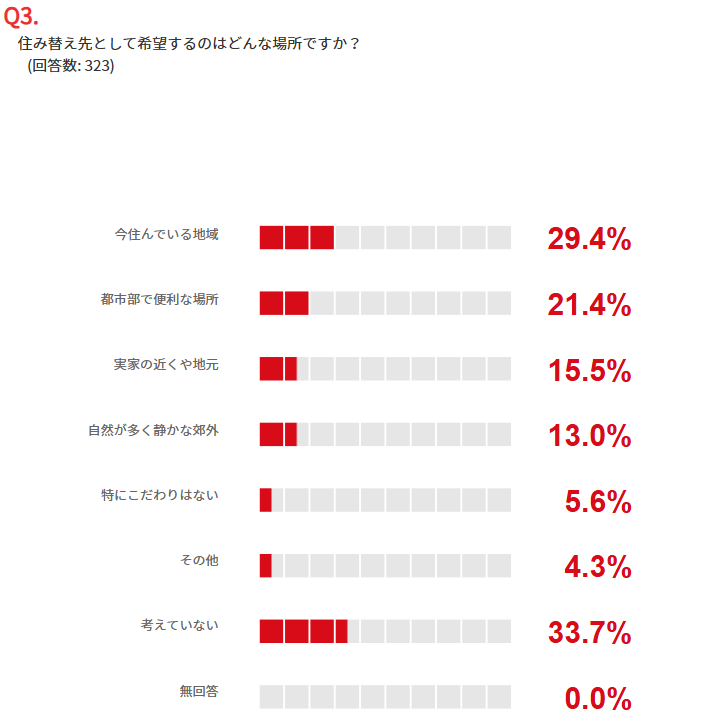 「住み替え先として希望するのはどんな場所ですか?」という質問に対し、最も多かった回答は「考えていない(33.7%)」でした。